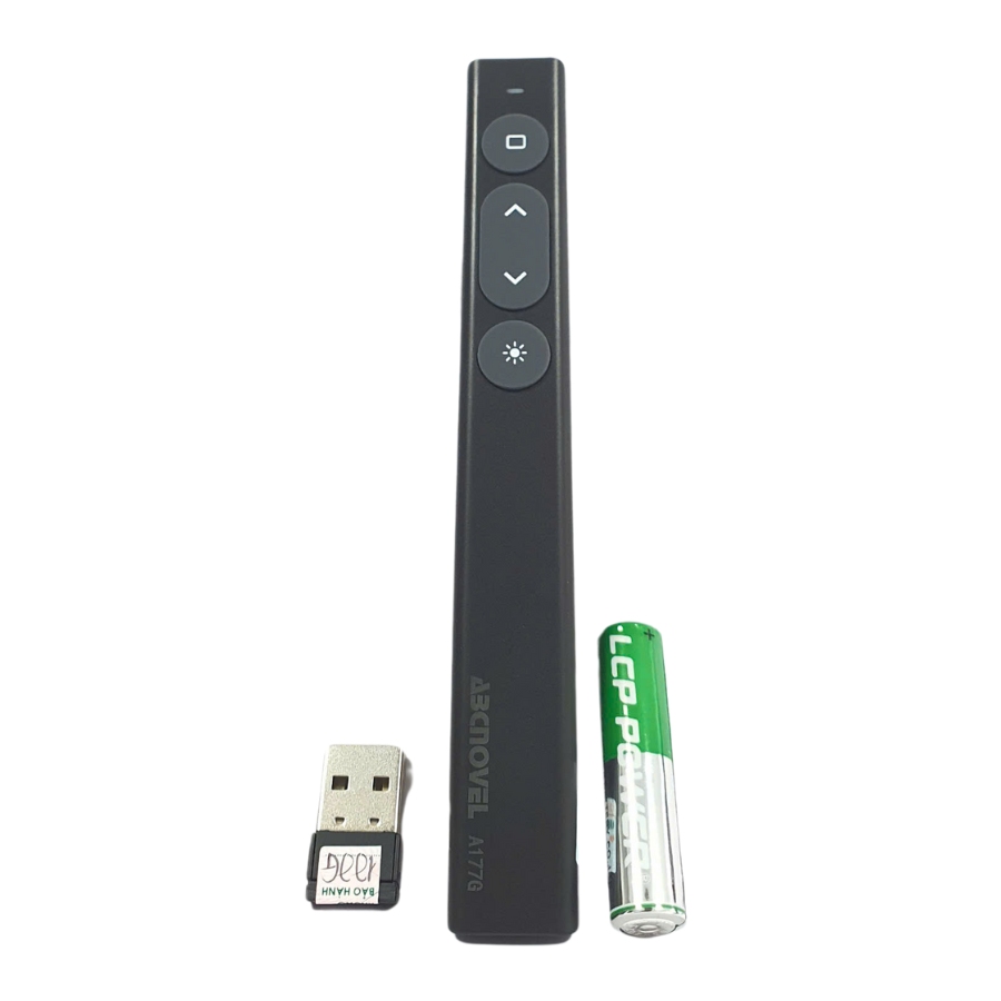 Bao gồm chức năng chuyển slide, điều khiển âm lượng, bật/tắt laser, và tạm dừng màn hình.