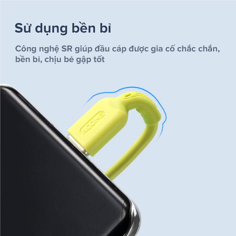 Acome AEC010 có độ bền cao với cấu tạo 3 lớp (Bao gồm lõi đồng nguyên chất; lõi cách điện và một lớp nhựa TPE). Công nghệ SR giúp đầu cáp được gia cố chắc chắn, bền bỉ, chịu gập bẻ tốt.