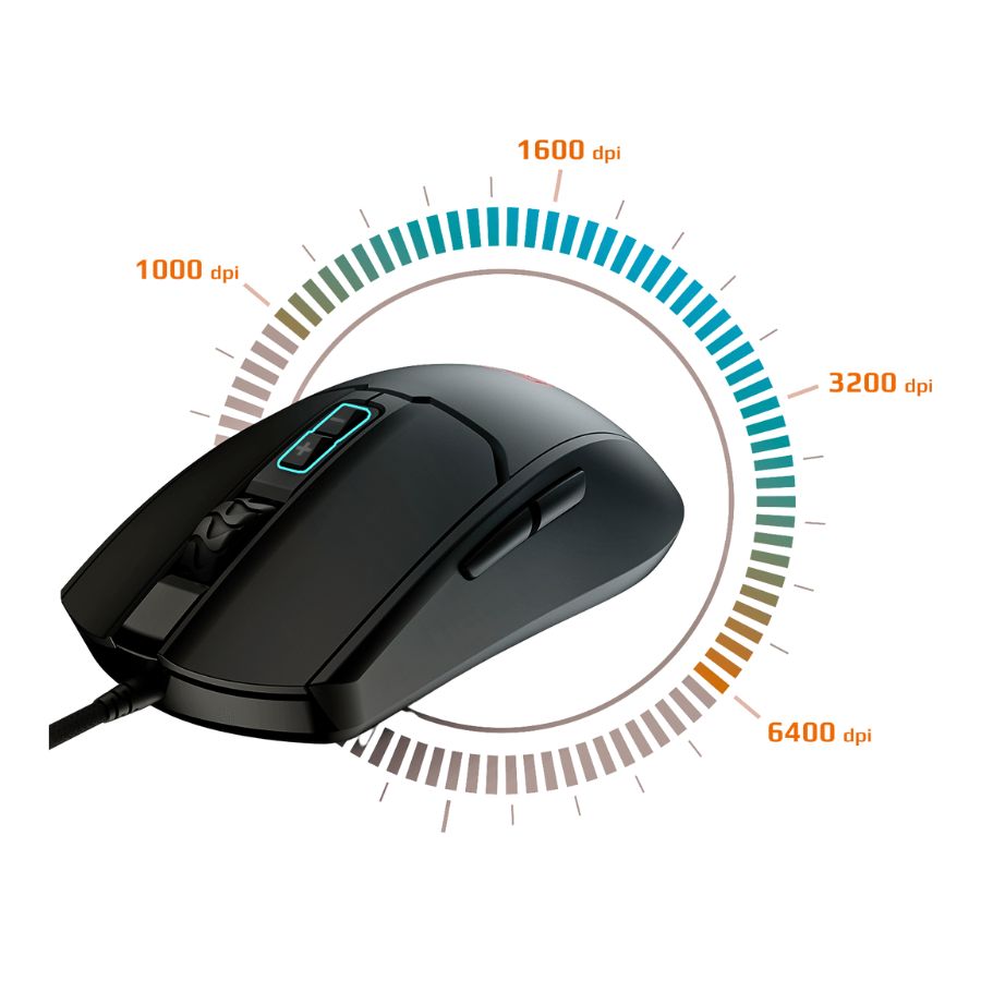 Chuột Gaming GM100 được trang bị cảm biến quang có độ phân giải lên đến 6.400 DPI. Đảm bảo theo dõi chuyển động mượt và chính xác. Bạn có thể chuyển đổi nhanh giữa 4 mức DPI là 1.000 / 1.600 / 3.200 / 6.400 để phù hợp cho từng tình huống chơi game.