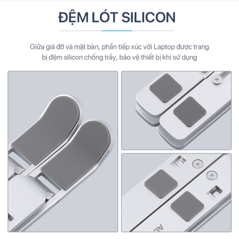 Để bảo vệ laptop khỏi trầy xước và trượt. Giá đỡ ALS01 được trang bị đệm lót silicon chống trầy. Điều này đảm bảo rằng laptop của bạn sẽ được giữ vững và chắc chắn trên bề mặt giá đỡ mà không bị trơn trượt hoặc bị hư hại.