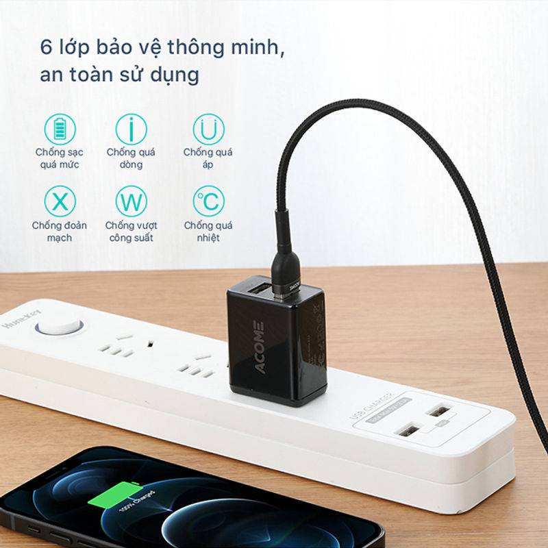 Khi sạc nhanh với công suất lớn nhất, nhiệt độ được kiểm soát thông minh, củ sạc không bị nóng, cùng với 6 lớp bảo vệ: